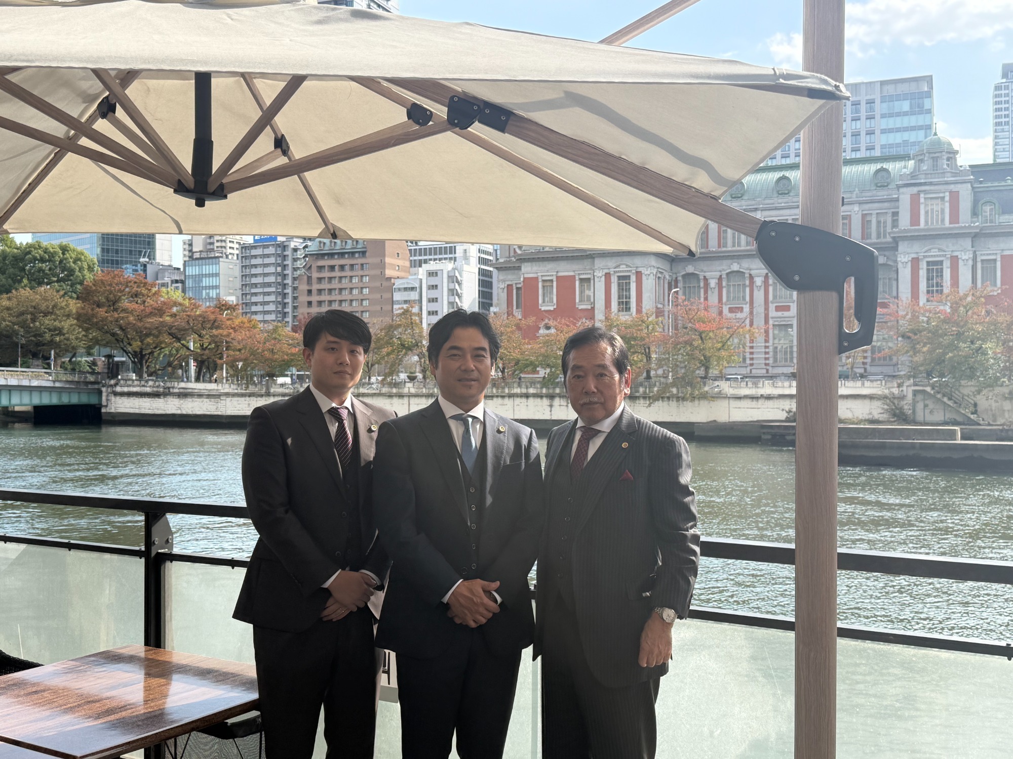 事務所傍の堂島川辺のレストランのテラスから中央公会堂を背に今年の誓いを結ぶ”三匹の侍”(左から權、正義、清孝各弁護士)